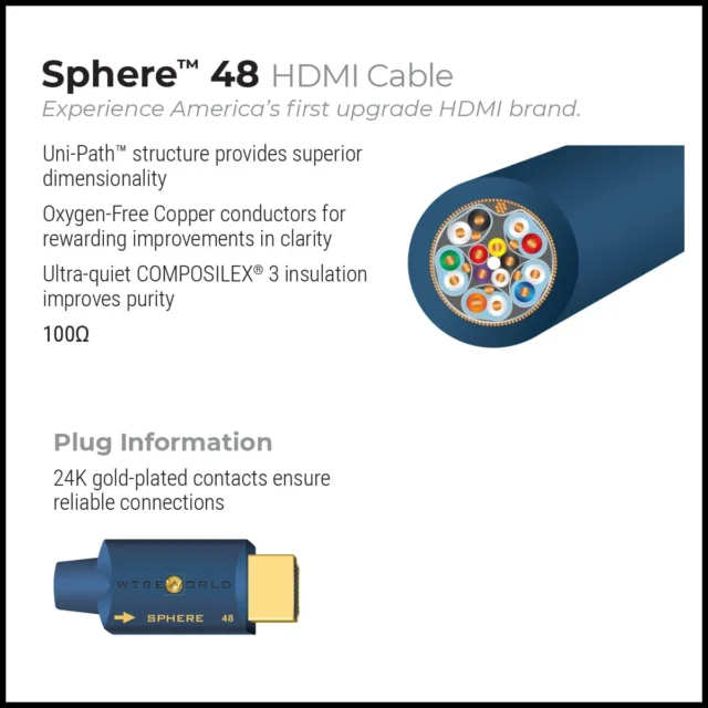 Wie sein Vorgänger bietet Sphere 48 erstklassige Klangqualität und verfeinert gleichzeitig die besten Eigenschaften der neuesten Videobildtechnologie. Die Kombination aus Wireworlds proprietärem Uni-Path™-Design und der ultraleisen COMPOSILEX 3-Isolierung sorgt für unübertroffene Klang- und Bildqualität. Dieses schnelle HDMI-Kabel übertrifft die Industriestandards für 48-Gbit/s-Übertragung und gewährleistet die Unterstützung aller HDMI 2.1-Funktionen, einschließlich 8K-Auflösung, Dynamic HDR, VRR, HDCP 2.3 und eARC (Enhanced Audio Return Channel). Kompatibel mit I 2 S High-End-Audioanschlüssen.